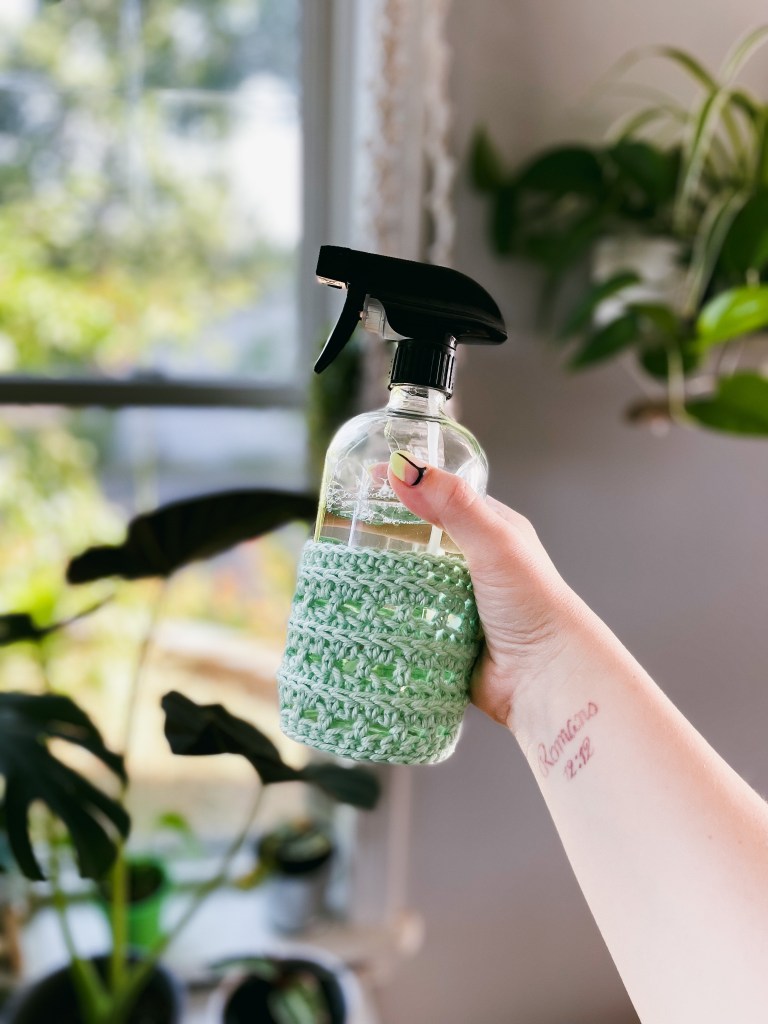 It was time to buy some more cleaning products and opting for the more earth-friendly products I decided it was time to get myself a glass spray bottle for my Plant Therapy multi-surface cleaner. When it arrived and I put the cleaner and water in the bottle and realized that I needed to make a cozy for the bottom to keep myself from breaking it.