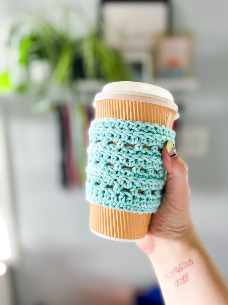 It’s time for the second pattern in the Olivine Collection, the cup cozy! Similar to the Spray Bottle Cozy but instead of having a base, it is open ended, perfect for travel tumblers and to go cups.