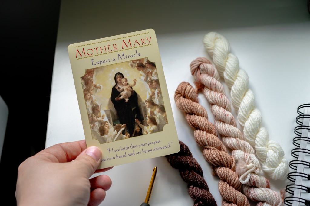 Sometimes coming up with pattern ideas are difficult and I decided to go to my Goddess Oracle Deck for some inspiration. The first card I pulled was Mother Mary with the message “Have faith that your prayers have been heard and are being answered.” This card always shows up when I need some hope and confidence that I’m on the right path.