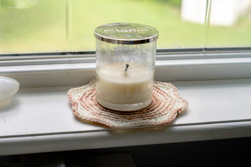 I searched my stash of yarn and found some minis I had dyed up for Meghan Makes Do Coffee Collection from a few years ago. With the theme of light and goodness, and the stars surrounding Mary’s head, I decided to design a mat specifically for under my candles on my window sill but it’s also the perfect mug rug size!
