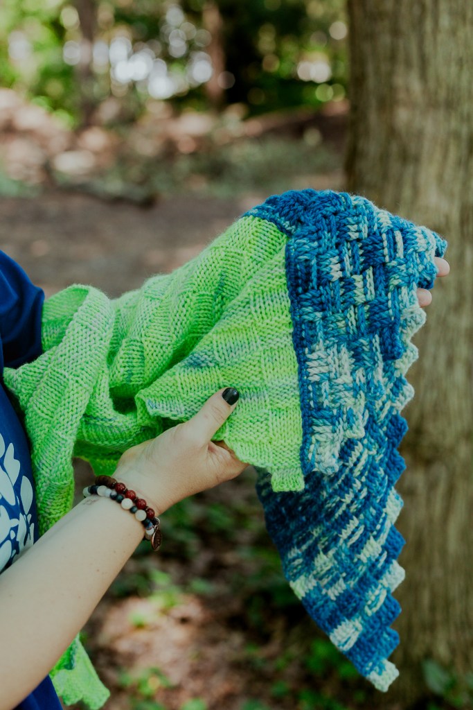 Today I am excited to share that the Checkered Shawl is out now. This shawl started out as a desire for a mindless knitting project using yarn that I dyed at The Makers Retreat in 2021. It had been hanging on my peg board for a long time and I have wanted to make something with it but i it needed to be the right project.